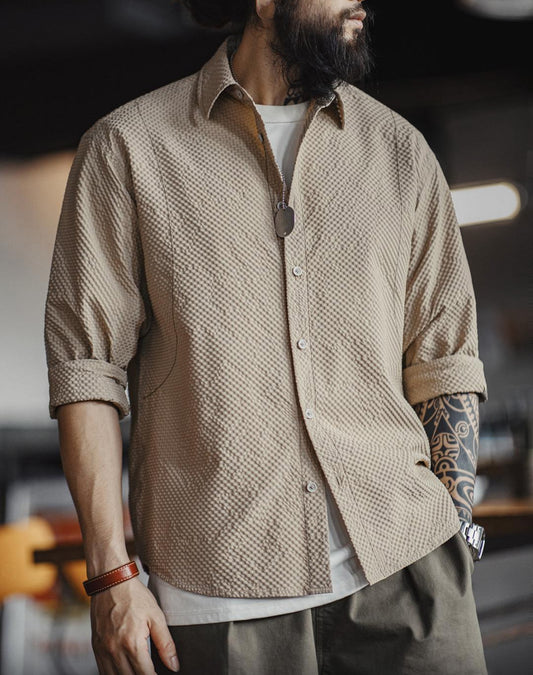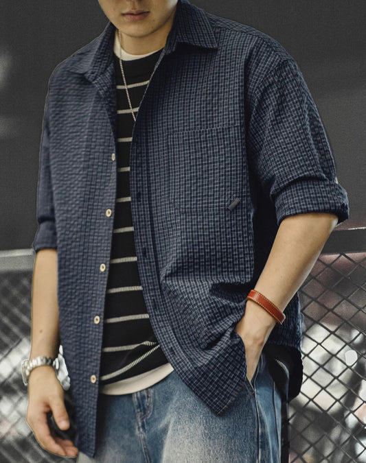 American Retro Seersucker Plaid Textured Lapel Stitching Men's Shirt