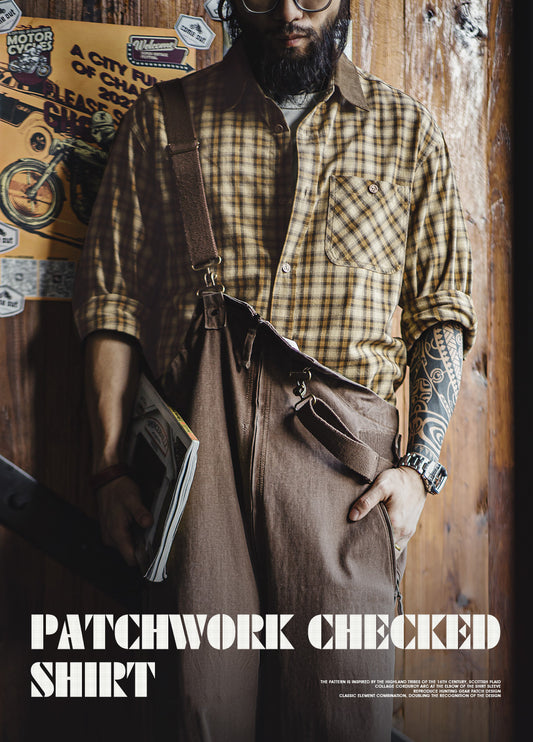 American Retro Workwear Scottish Plaid Corduroy Splicing Men's Shirt