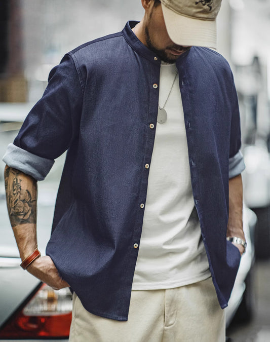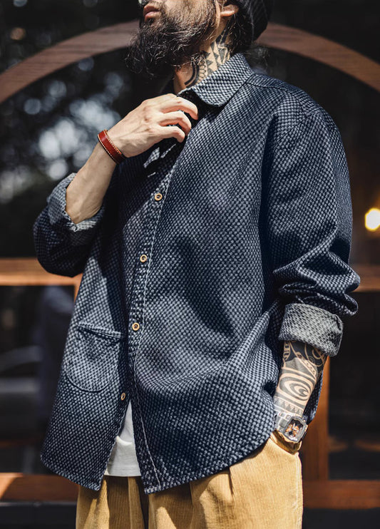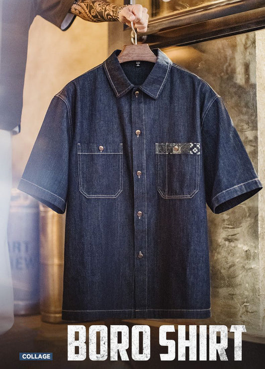 American Retro Boro Denim Resurgence Blue Dye Lapel Men's Shirt