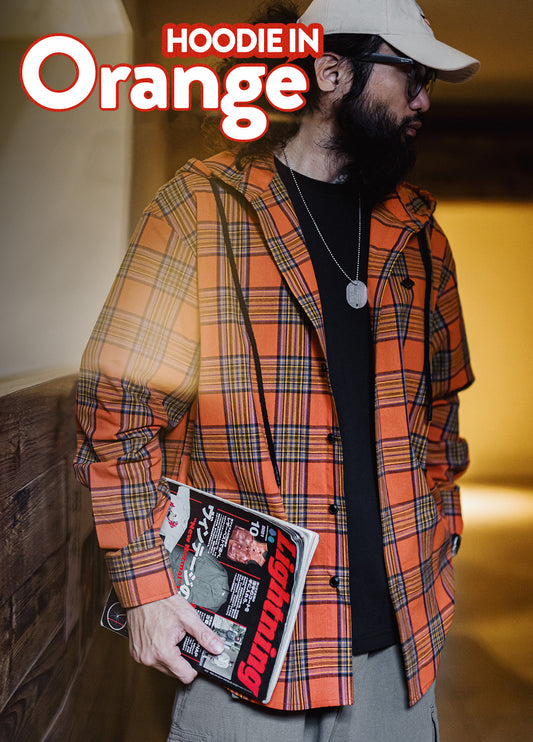 American Retro Casual Yarn-Dyed Orange Hooded Plaid Loose Men's Shirt