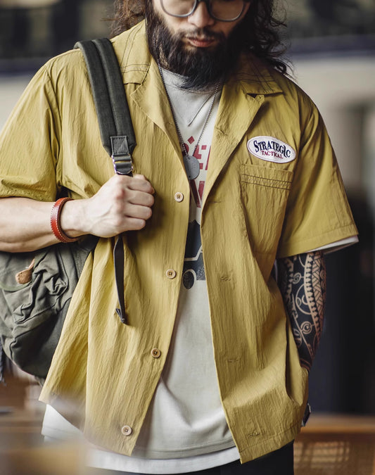 American Workwear Retro Wrinkled Cuban Collar Thin Men's Shirt
