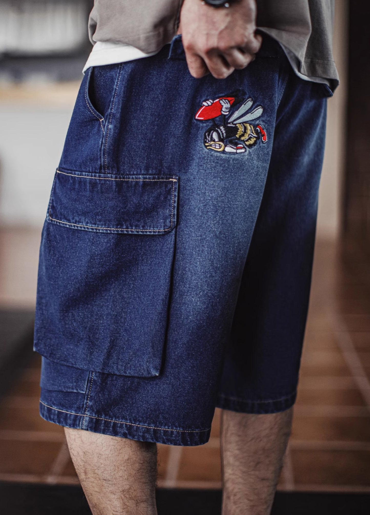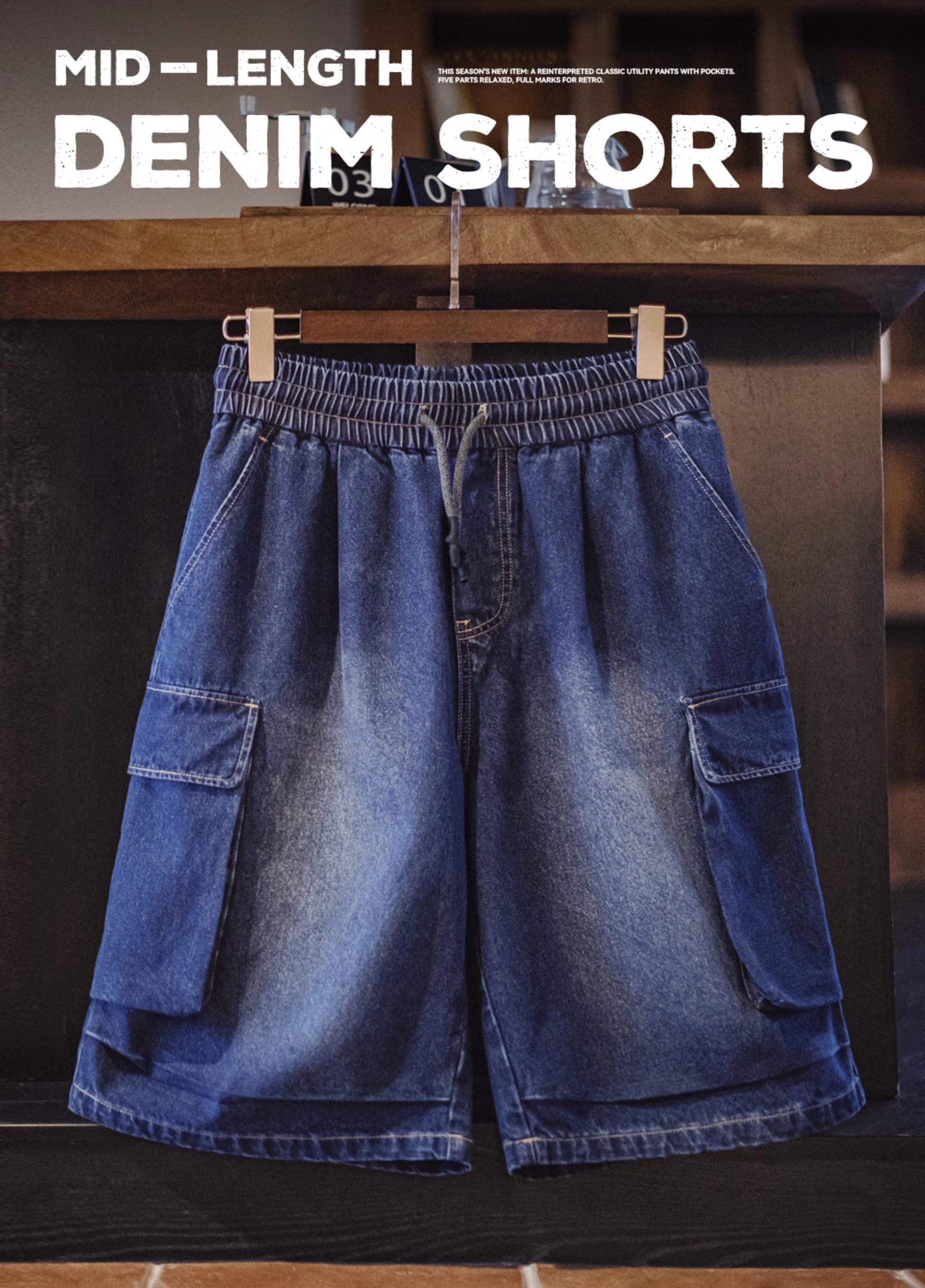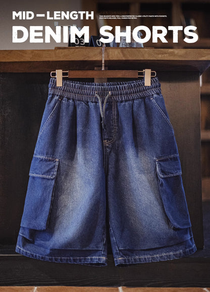 American Retro Washed Blue Embroidered Double Pocket Paratrooper Men's Shorts