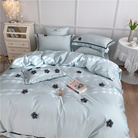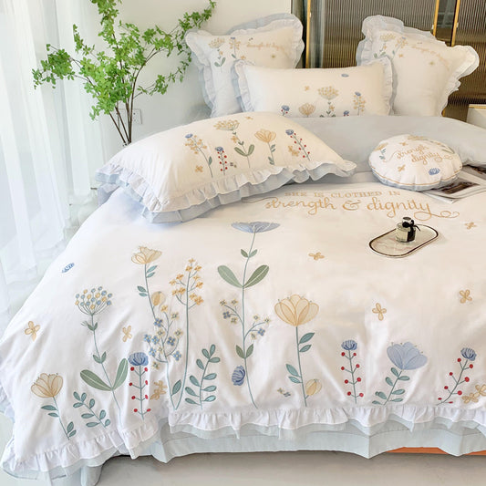 Juego de cama con bordado de flores de cuatro piezas de algodón lavado con encaje de hadas