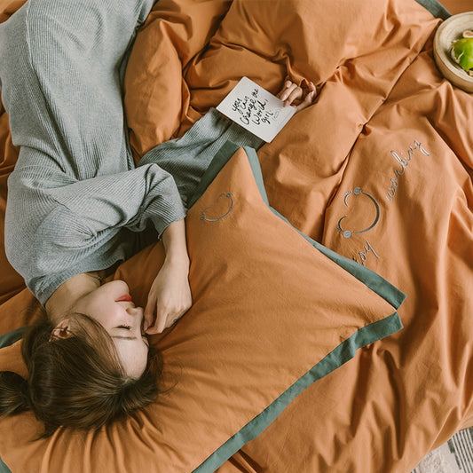 Juego de cama de cuatro piezas de color sólido simple con borde de algodón puro