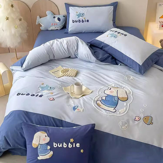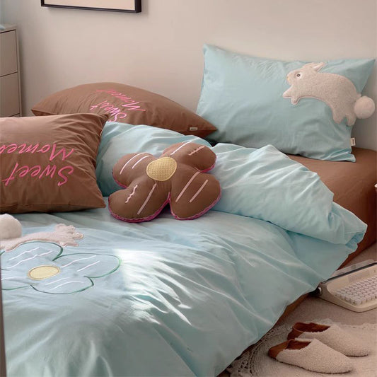 Ensemble de lit en coton lavé quatre pièces, dessin animé mignon, couleur contrastée créative