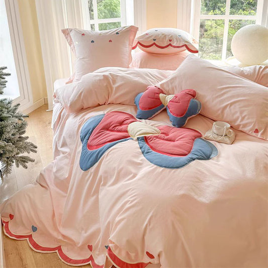 Ensemble de lit quatre pièces en pur coton lavé avec nœud mignon et cœur Girly