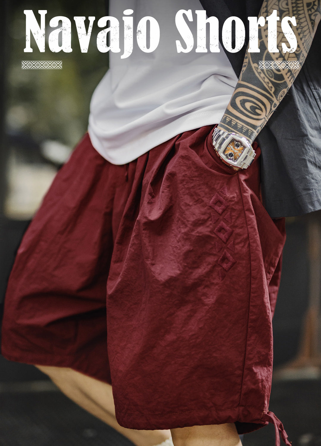 The embroidered Navajo-style detailing gives them a unique edge without being over the top. It's just the right pop of personality to turn heads and start conversations. Available in deep blue or bold red, they match up with your favorite tank, tee, or short-sleeve button-up.
