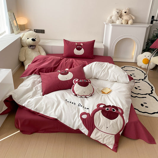 בובו דוב תות מצויר כותנה שטופה סט מיטה בארבע חלקים