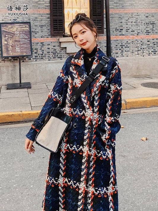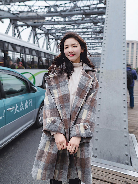 Bő kockás Tweed gyapjú, középhosszú női kabát