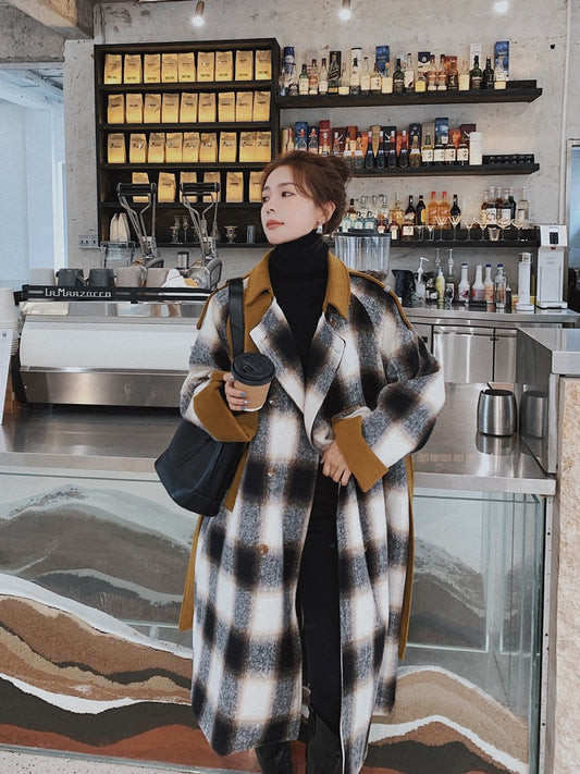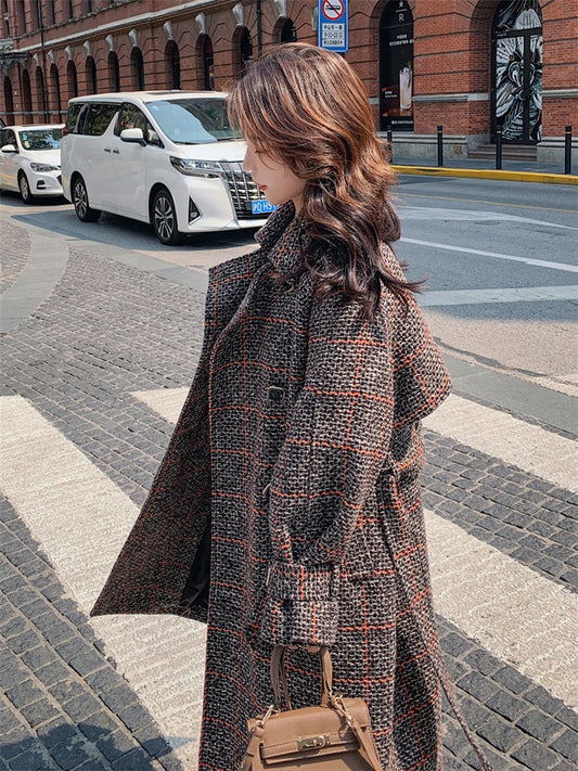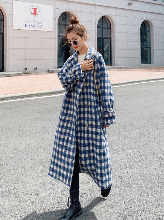Divatos Retro kockás, középhosszú gyapjú női kabát
