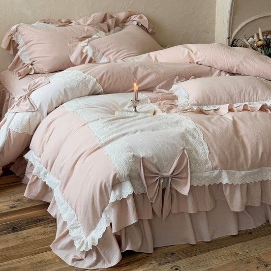 French Retro Romantic Cotton And Linen Blend Four-Piece Lace Trim Bow Bed Set