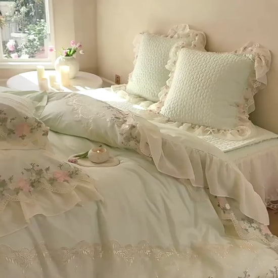 The floral pattern adds a soft charm that brightens your room without making it feel busy. The green and pink tones bring a calm, pretty look that lifts your mood each time you walk in. The lace trim adds that subtle princess touch, so your bed looks stylish with zero effort.