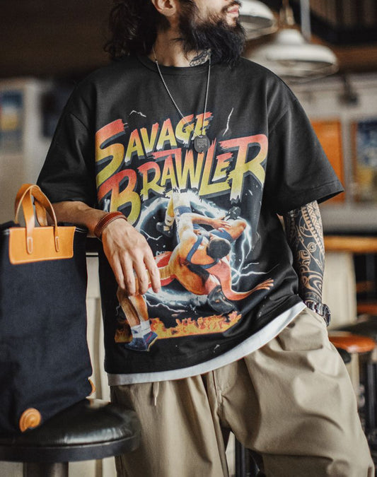 American Retro Heavy High Street Print Pure Cotton Loose Men's T-Shirt