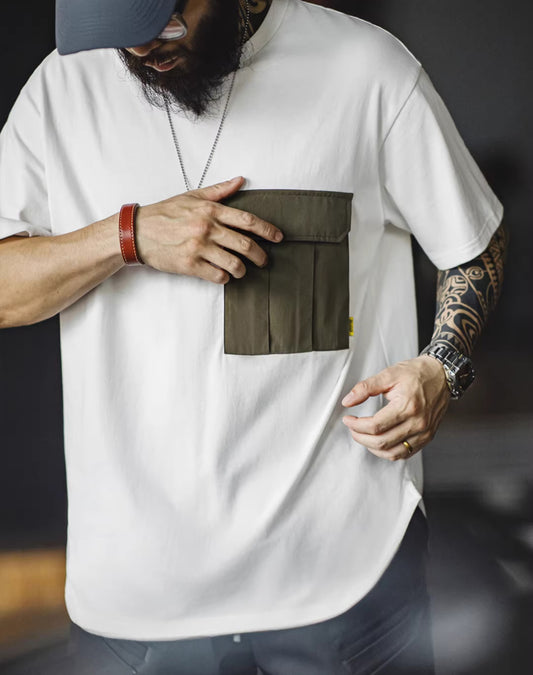 American Retro Army Green Pocket Mountain Knitted Heavy Men's T-Shirt