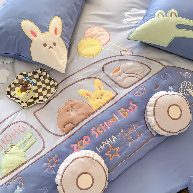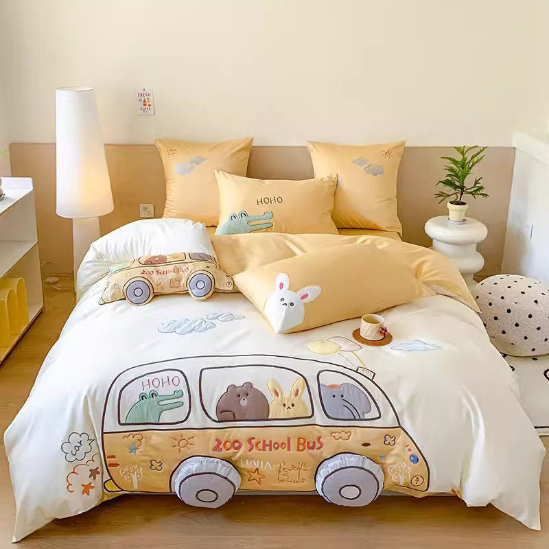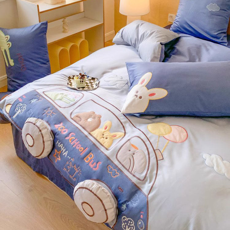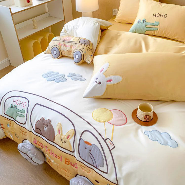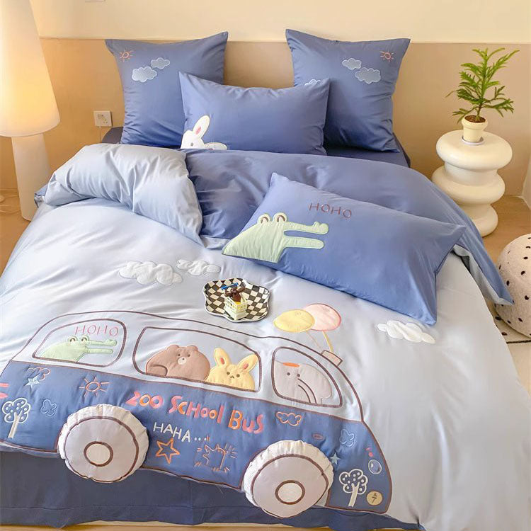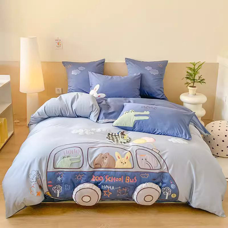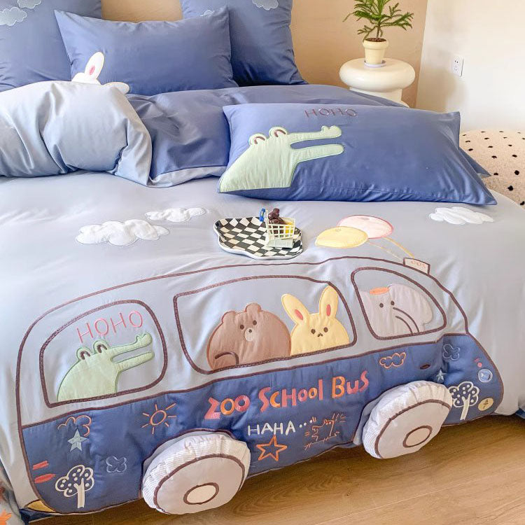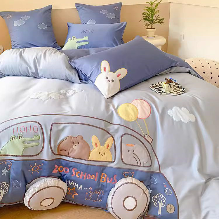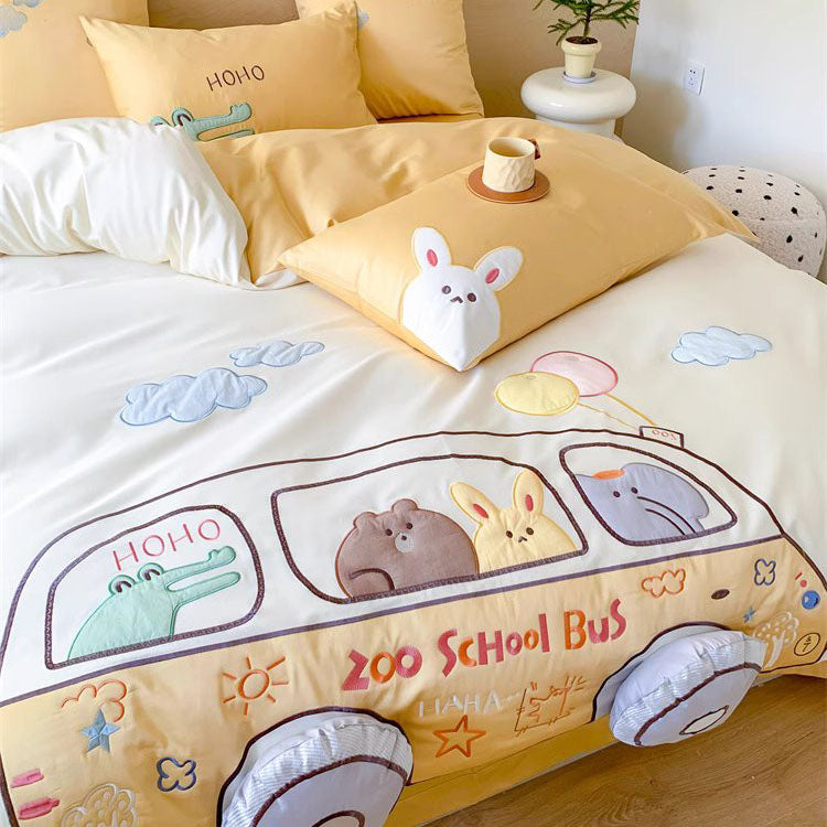 Tecknad Happy Bus Zoo School fyra delar ren bomull sängset