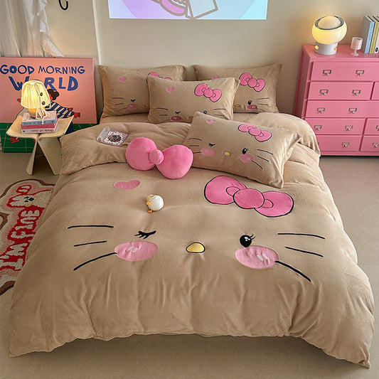 Children's Hello Kitty Little Milk Fleece Cartoon Winter Four-Piece Bed Set